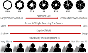 The adjustable opening—or f-stop—of a lens determines how much light passes through the lens on its way to the film plane, or nowadays, to the surface of the camera’s imaging sensor. “Faster” lenses have wider apertures, which in turn allow for faster shutter speeds. The wider the aperture is set, the shallower the depth of field will be in the resulting image.
